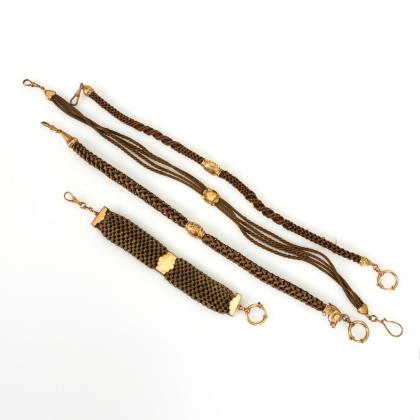 4 verschiedene Haarketten mit gravierten, vergoldeten Metallhohlgliedern
