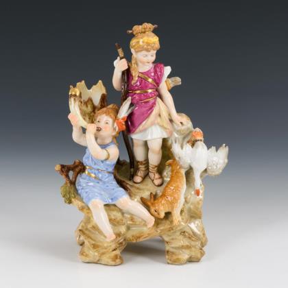 Zwei Mädchen mit Jagdhorn und Bogen auf einem Felssockel, zu ihren Füßen ein erlegter Hase und eine erlegte Ente