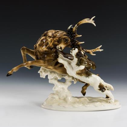 Plastik eines Hirsches, der von einem Jagdhund angegriffen wird