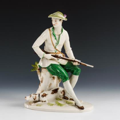 Auf einem Baumstumpf sitzender Jäger mit Hund