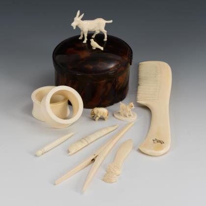 Schildpatt-Dose und Konvolut zumeist aus Elfenbein