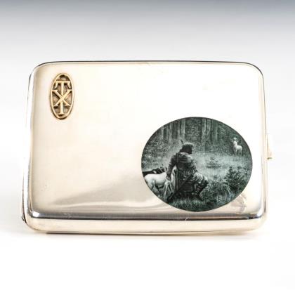 Jagdliches Zigarettenetui aus Silber mit Hubertusbild und Gold-Monogramm