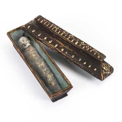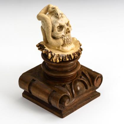 Zusammen mit der großen Hirschrose aus einem Stück geschnitzter Vanitas-Schädel mit Schlange und Frosch