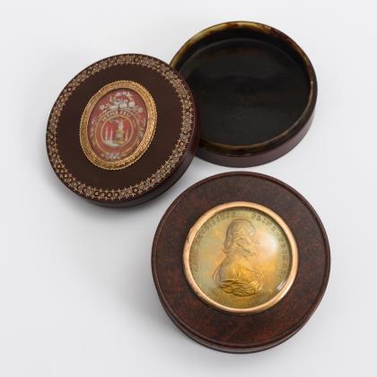 Wohl braunen Jaspis imitierende Dose mit Liebes-Altar "Même Feu" im Goldrahmen. / Roten Jaspis imitierende Dose mit dem Bildnis des Karl Theodor von Dalberg (1744-1817)