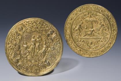 Beidseits sehr fein reliefiert. Im Spiegel je eine figürliche Szenerie: Das Urteil des Paris und Allegorie: Der Reichtum. Am Rand Ornamentbordüren. Flache Form