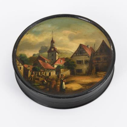 Runde Dose; auf dem Deckel idyllisches Dorf mit Staffage