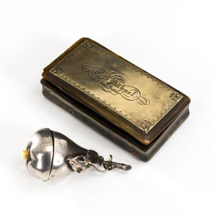 Dienstbotenklingel in Birnenform mit Elfenbeinknopf. Quaderförmige Tabakdose mit Gravur "C.H. Hähnel" an der silberfarbenen Metallmontierung auf dem Deckel