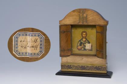 2-türiger Mahagoni-Korpus mit Bronze-Beschlag, partiell geschwärzt. Im Giebel appliziertes bekröntes Monogramm, innen Ikone: Christus Pantokrator, kyrillisch bezeichnet. Rückseitig alter Sammlungs-Klebezettel