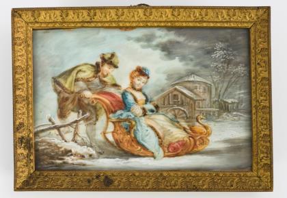 Von einem Edelmann im Rokoko-Schlitten geschobene Dame