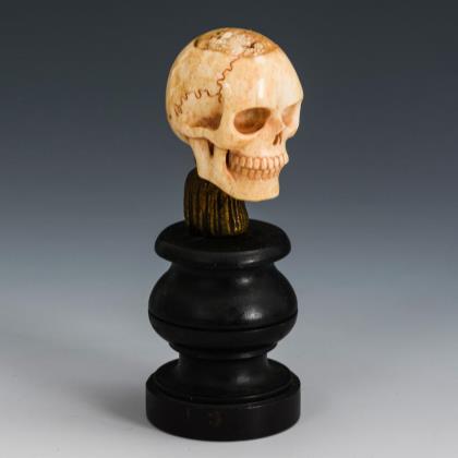 Geschnitzter Totenschädel auf gedrechseltem Sockel