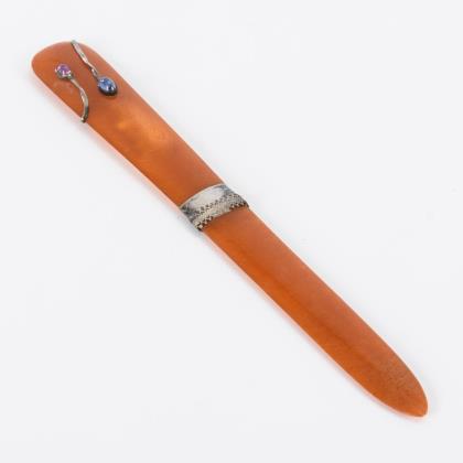 Seitenwender aus Bernstein? mit Farbsteinen und Silbermanschette