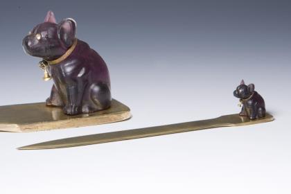 Bronze und amethystfarbenes Glas. Hund mit applizierten Strass-Augen, Metall-Halsband mit Glöckchen. Rückseitig alter Klebezettel