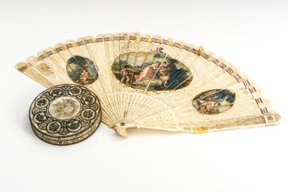 Elfenbein-Briséfächer mit 3 Farblithografien (Szenen mit Amor) und Strass. / Gemarkte Pappdose mit floraler Reliefzier auf dem Passdeckel