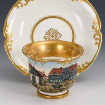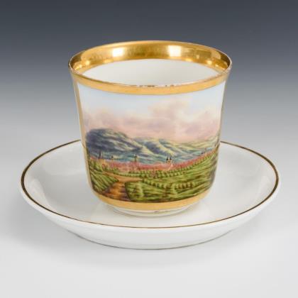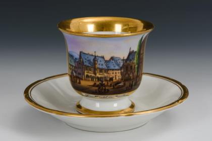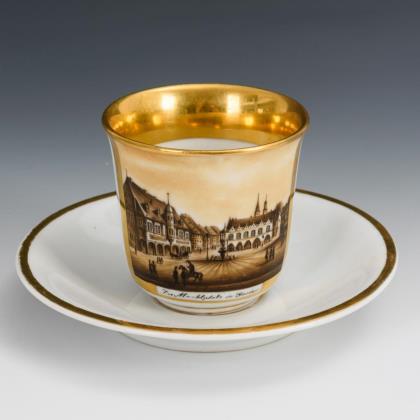 Kratertasse. Schauseitig eine Rechteckkartusche mit der polychrom gemalten, bezeichneten Ansicht der Stadt Goslar