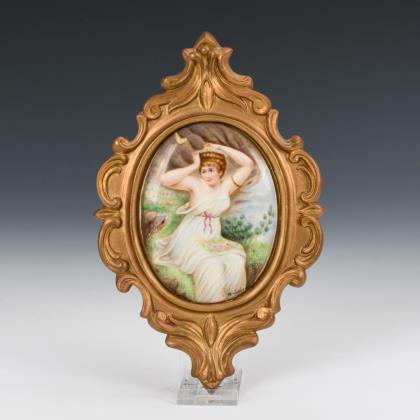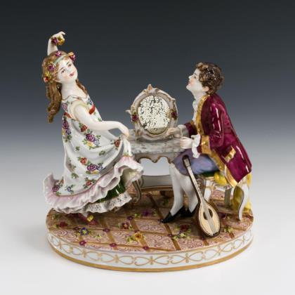 Modell "Antikzierat". Im Spiegel eine fein gemalte galante Szene. Verso Wandaufhängung