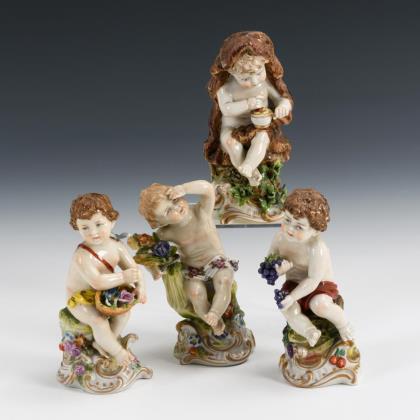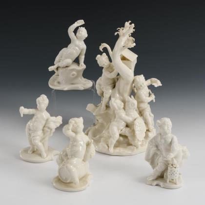 Gruppe "Putten beim Vogelfang" (H 21,5 cm) sowie Putto als Bacchus, Putto als Faun, Putto als Ceres, Putto als Winter (H 10-12 cm)