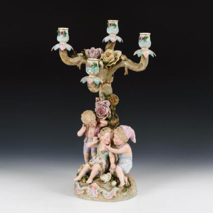 4-flammiger Leuchter mit Baumstammschaft sowie drei am Stamm sitzenden Kindern, mit Rosenblüten belegt
