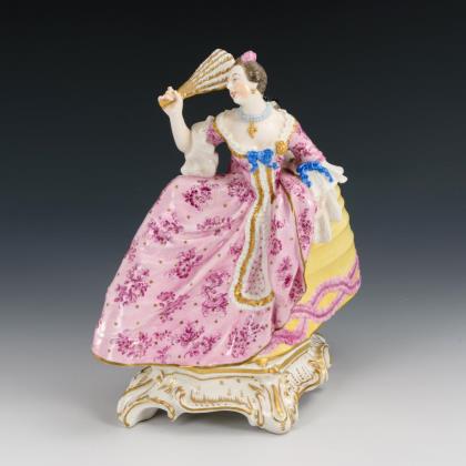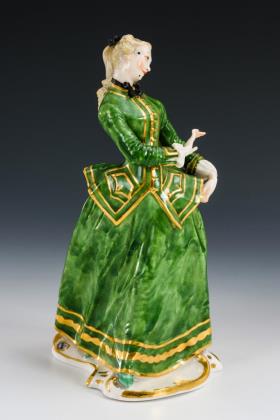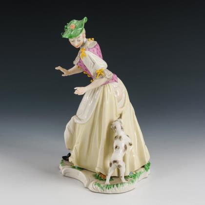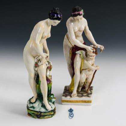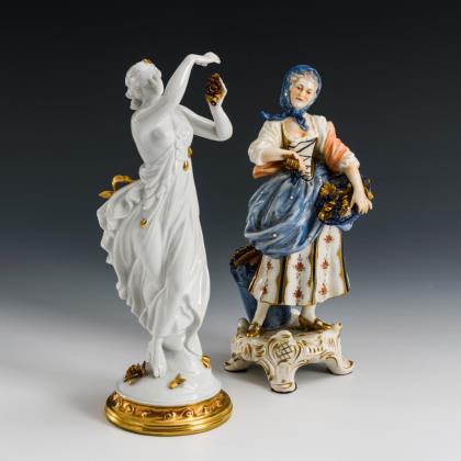 Auf einem Rocaillesockel stehende Winzerin mit Traubenkorb und traubengefüllter Kiepe. / Auf einem Rundsockel in tänzerischer Pose stehende junge Frau mit Rosenblüte