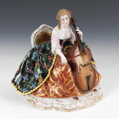 Sitzende, ein Cello spielende Reifrockdame