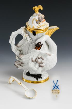 In Form einer Schwanenkanne gestaltetes Gefäß mit Tierkopfdeckel und Löffelchen