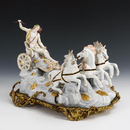 Nach einem Modell für die Porzellanmanufaktur Meissen, Entwurf von Johann Joachim Kaendler, 1773. Apoll auf einem von vier Pferden gezogenen, über Wolken fahrenden Triumphwagen, bronzemontierter Sockel