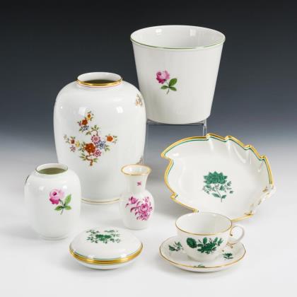 8 Teile. Verschieden Floralmalerei (u.a. kupfergrün, purpurfarben, bunt). 3 Vasen (8,5, 10 und 18 cm), Cachepot (H 12,5 cm), flache Dose (Ø 9,5 cm), Mokkatasse (H 5 cm) mit Untertasse (Ø 11,5 cm) und Blattschale (17,5 cm)