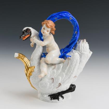 Figürlich gestaltete Kanne in Form eines Schwanes, auf dem ein Putto reitet