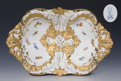Ovale Schale mit durchbrochenen Handhaben und reicher Goldmalerei. Im Spiegel die verso bezeichnete Ansicht der Stadt Heide in Schleswig-Holstein