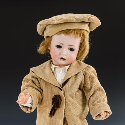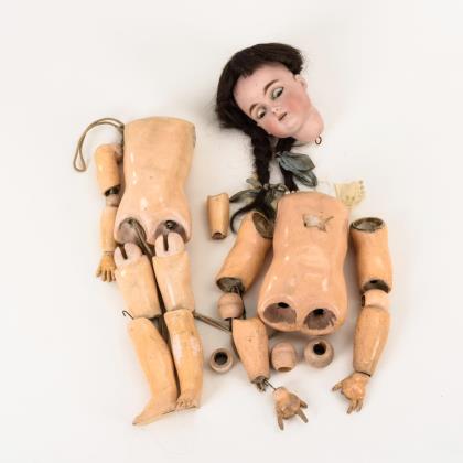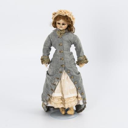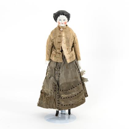 Glasierter Brustkopf mit modellierten Haaren. Alter Körper mit glasierten Porzellanarmen und -beinen. Originaler Rock mit Jacke
