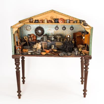 Große Gründerzeit-Puppenküche auf Drechselbeinen