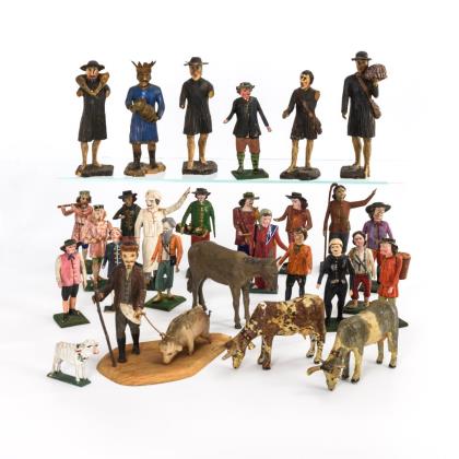 23 Figuren (u. a. Hirten, Musikanten, volkstümliche Herren), 4 Tiere, 1 Schweinehirt mit Schwein auf Sockelplatte
