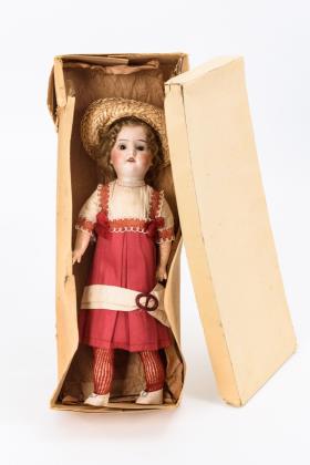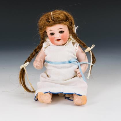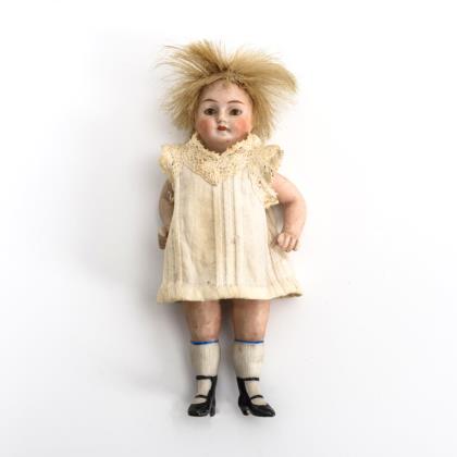 Ganzbiskuit-Püppchen mit festem Kopf, braunen Glasaugen, geschlossenem Mund und festgeklebter Echthaarperücke. Gemalte Schuhe und Strümpfe, im Unterhemd