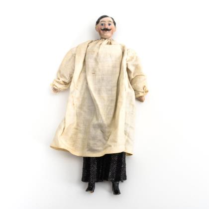 Herr mit modelliertem, bemaltem Kopf, Armen und Händen. Stoffkörper. Bekleidet mit Hose und einem weißem Kittel (geeignet als Verkäufer in einem Kaufmannsladen)