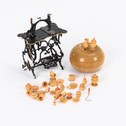 Kleine, nachlackierte Nähmaschine mit Fußantrieb./ Rundes Döschen mit Miniatur-Geschirr aus Holz