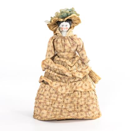 Glasierter Brustkopf, Stoffkörper und Porzellanglieder. Originales Kleid und Hut