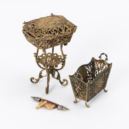 2 durchbrochen gearbeitete Möbelchen sowie winziges Miniatur-Strickzeug