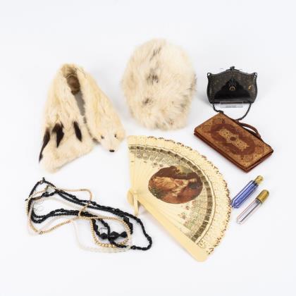 Fellmütze und Nerzkragen, rotbraune Ledertasche mit Goldprägung, Metalltasche mit Goldverzierungen, schwarze Kette, Glasperlenkette, Kunstperlenkette, Fächer sowie 2 Riechfläschchen aus Fadenglas