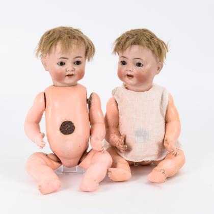 Zwillingspuppen mit Kurbelkopf, braunen Schlafaugen, offenem Mund, 2 Zähnchen, blonder Mohairperücke und 5-teiligem Sitzbabykörper mit Stimme. 1x unbekleidet, 1x mit Hemdchen