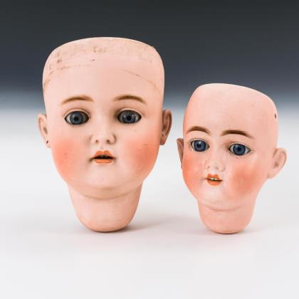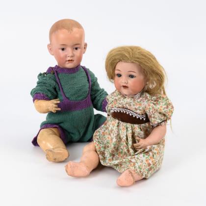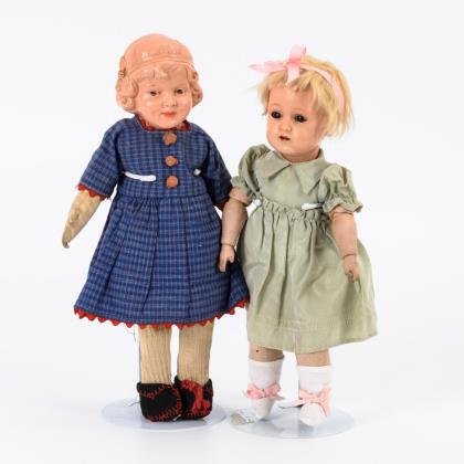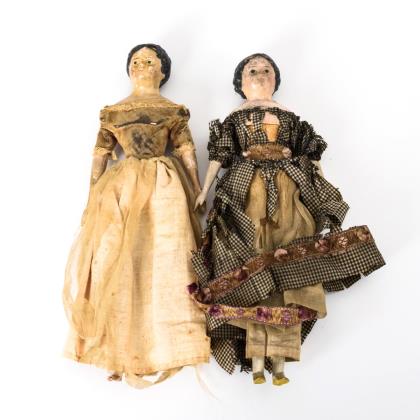 Puppen mit Papiermaché-Brustkopf, geschlossenem Mund, gemalten Augen und modellierten Haaren. 1x originaler Lederkörper, 1x originaler Stoffkörper, beide mit Holzarmen und -händen. Beide original bekleidet