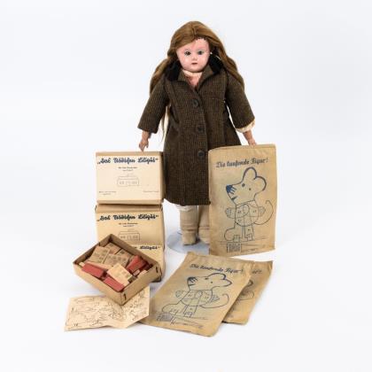 Bemalter Kurbelkopf (Typ I) mit braunen Haaren, Körper mit locker angenähten Armen, Beine mit Scheibengelenken. Schwarzes Cape, blaue Hose. Dazu 6 Teile Kleidung: 2 Jacken, roter Bademantel, Mütze, rote Zipfelmütze und brauner Samtrucksack