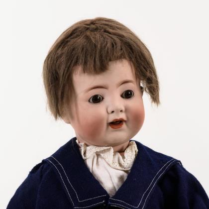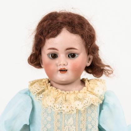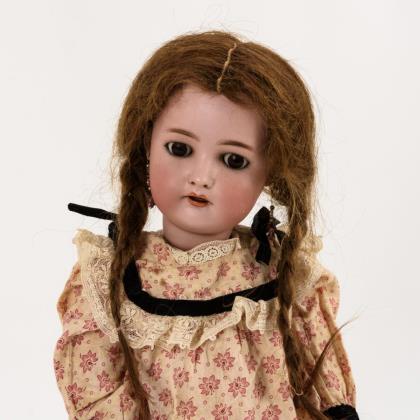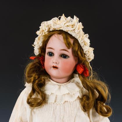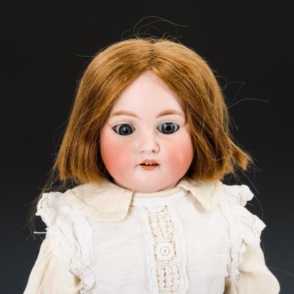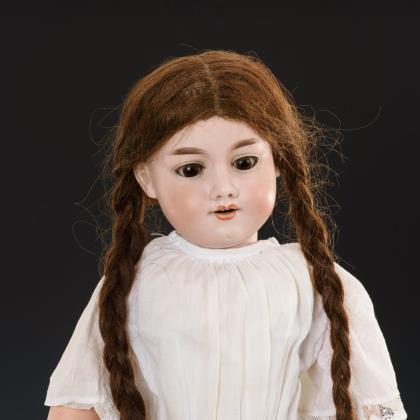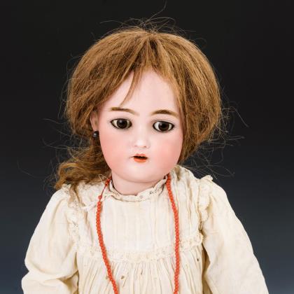 Kurbelkopf, blaue Schlafaugen mit Echthaarwimpern, offener Mund mit Zahnreihe, durchstochene Ohrläppchen, ergänzte Echthaarperücke. 15-teiliger Gliederkörper.