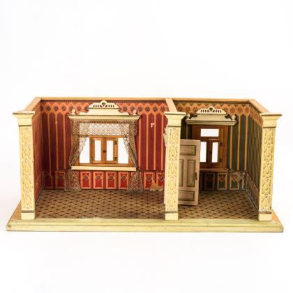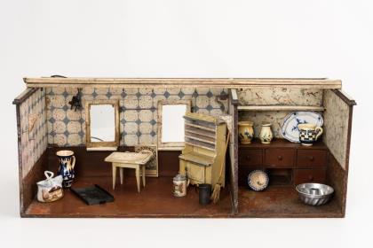 Original gefasstes 1-Raum-Gehäuse mit Dreiecksgiebel und breitem Gesims. Küche mit reicher Ausstattung (Eisenwaren und teils alte Bauernkeramik), Eisenherd und Eckschrank sowie einer kleinen Porzellankopfpuppe in zeitgemäßer Kleidung