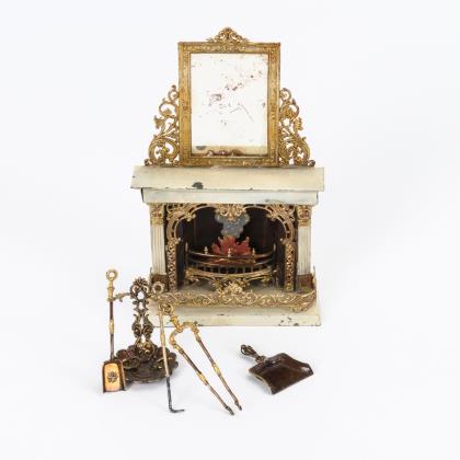 Prächtiger Kamin mit Aufsatzspiegel und "brennendem" Feuer. Dazu Ständer mit 4 Teilen Kaminbesteck