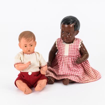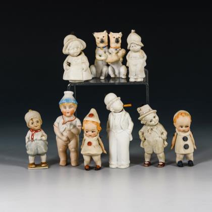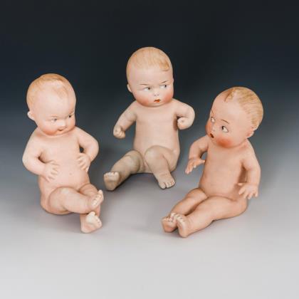 Ganzbiskuitpuppen (ähnlich Pianobabies) als nackte, sitzende Kinder mit ausdruckvollen Gesichtern