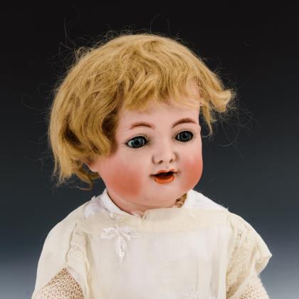 Kurbelkopf, blaue Schlafaugen, offener Mund, Zähnchen, blonde, leicht verfilzte Perücke. 15-teiliger Gliederkörper mit leichtem Farbabrieb. Weißes Kleid