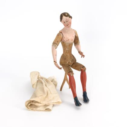Wohl als Sitzfigur konzipierte Frau mit 8 beweglichen Holzgelenken sowie ausdrucksstarker barocker Kopf- und fingerhaltung