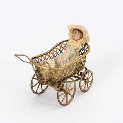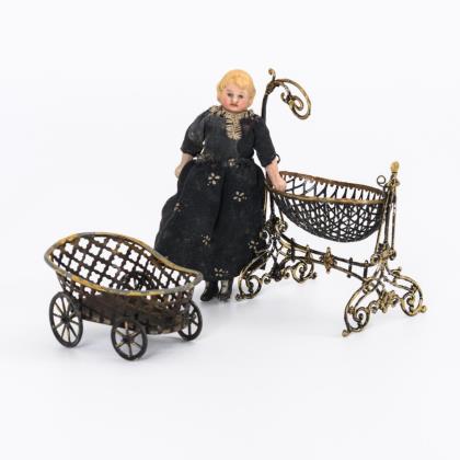 Wiege mit reich verziertem Gestell, ovaler kleiner Wagen und Püppchen mit Brustkopf, Stoffkörper und Biskuitgliedern. Originales schwarzes Kleid