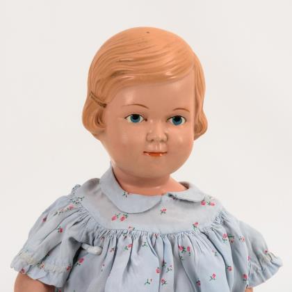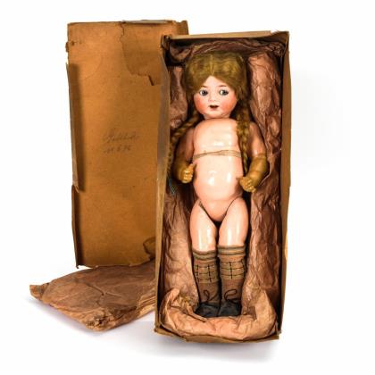 Kurbelkopf, blaue Schlaf-/Schelmenaugen, offener Mund mit 2 Zähnchen und beweglicher Zunge, blonde Echthaarperücke mit Zöpfen. Stehpuppenkörper mit 2-geteiltem Torso und intakter Stimme, 2 übermalte Arme lose anbei. Unbekleidet, mit originalen Schuhen und Strümpfen
