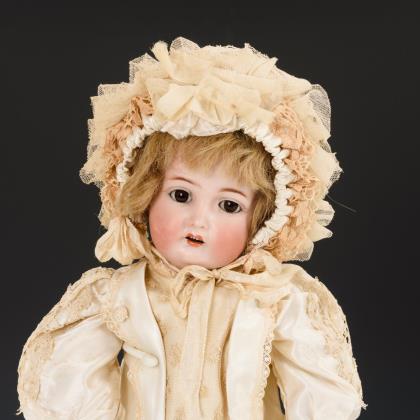 Kurbelkopf, braune Schlafaugen, offener Mund mit Zahnreihe, blonde Echthaarperücke. 15-teiliger Gliederkörper. Cremefarbenes, nachgenähtes Kleid, passende Haube, weiße Lederschuhe