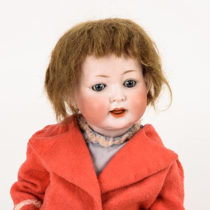 Kurbelkopf, blaue Schlafaugen, offener Mund mit 2 gemalten Zähnchen und modellierter Zunge, dunkelblonde, leicht verfilzte Perücke. 5-teiliger Sitzbabykörper mit locker gespannten Gliedern. Blaues Kleidchen, roter Mantel